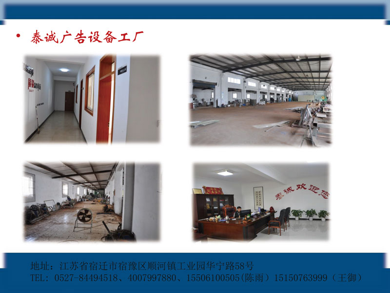 江蘇泰誠科技設備有限公司是以候車亭、景觀燈箱、閱報欄、智能垃圾箱、標識標牌、指路牌、垃圾分類亭等設計、生產、銷售為一體的現代化廣告設備公司位于宿遷市宿豫順河工業園區,交通十分便捷。